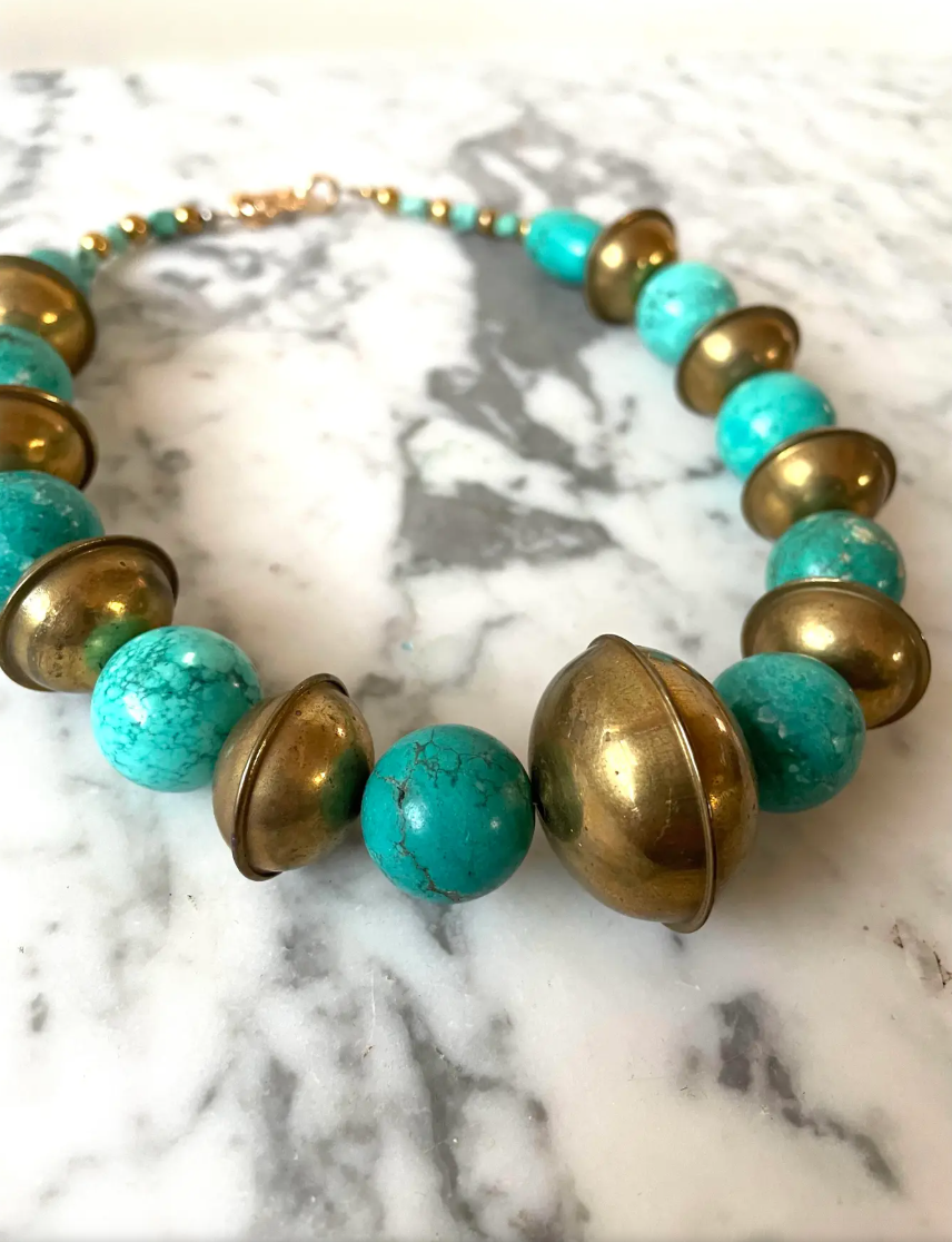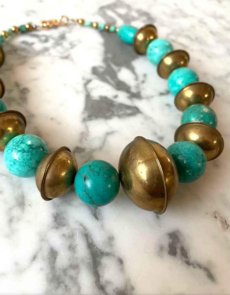 19.5" Turquoise and Vintage Brass Beaded Necklace With Gold Tone Hook Clasp - Designed by Matthew Izzo