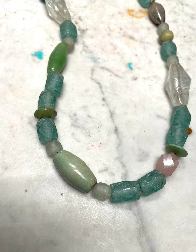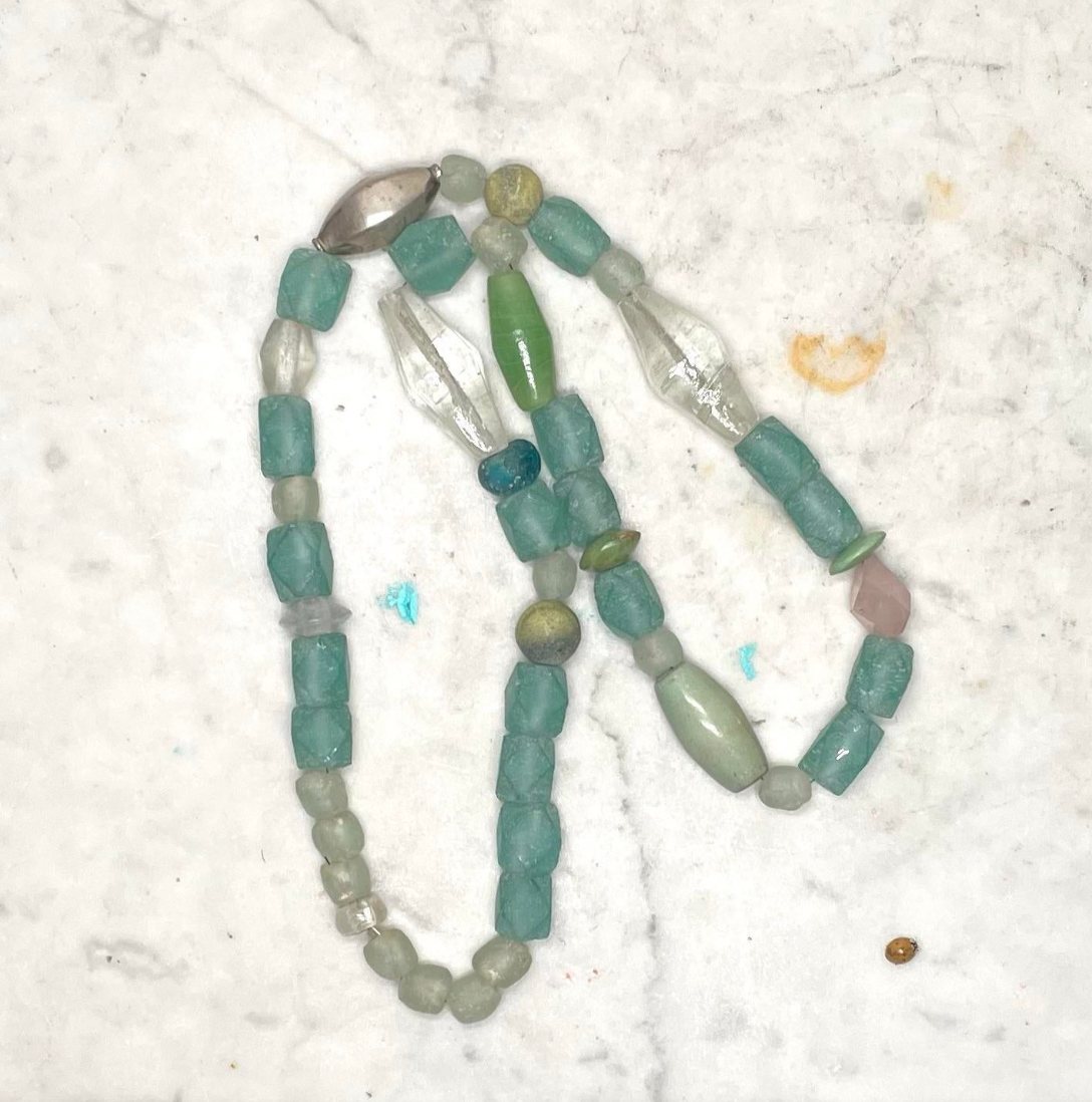 Vintage Turquoise Glass, Silver, and African Trade Bead Boho Necklace