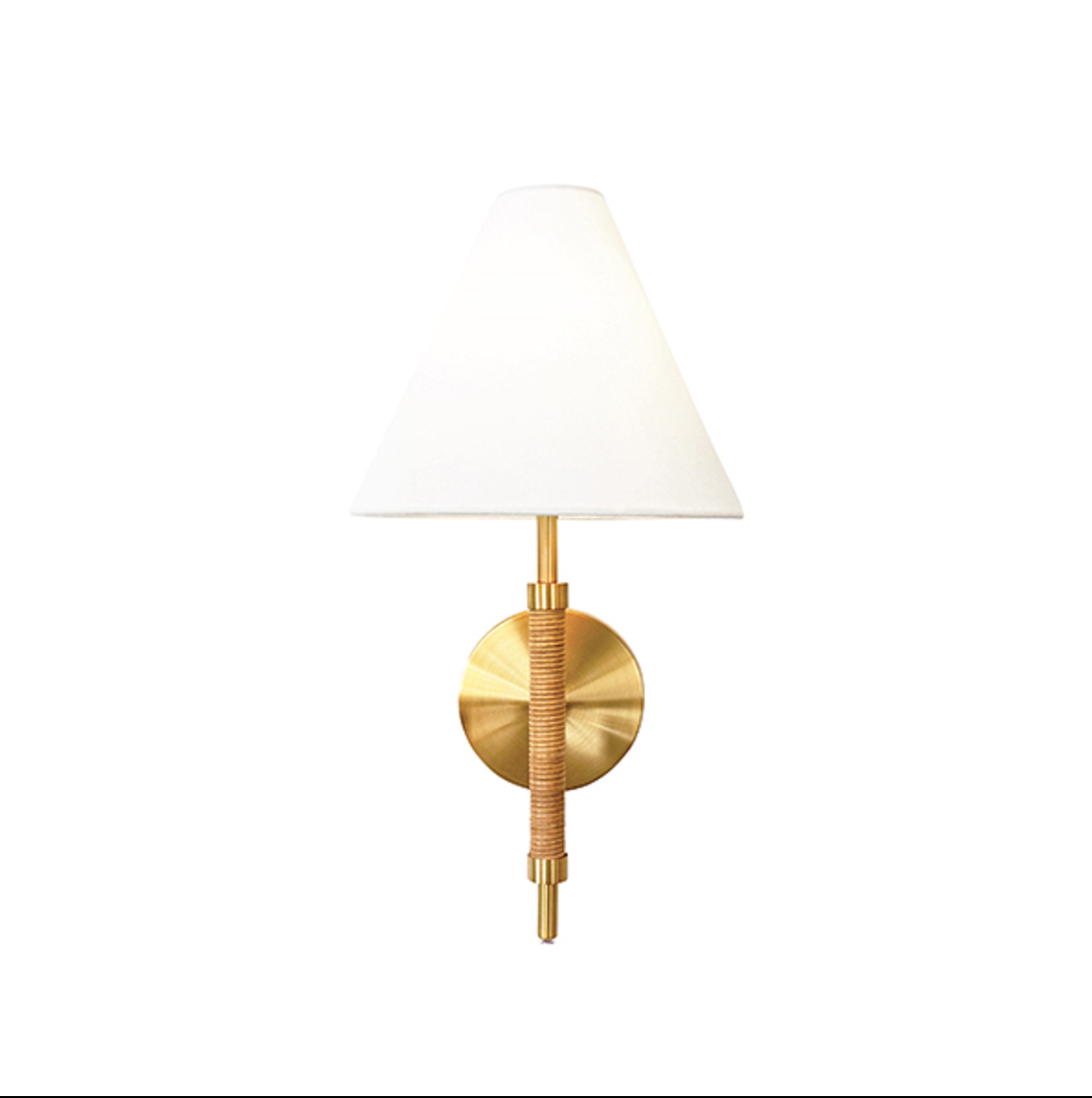Sylvia Rechargeable Wall Sconce w/White Linen Shade - Rattan & Brass