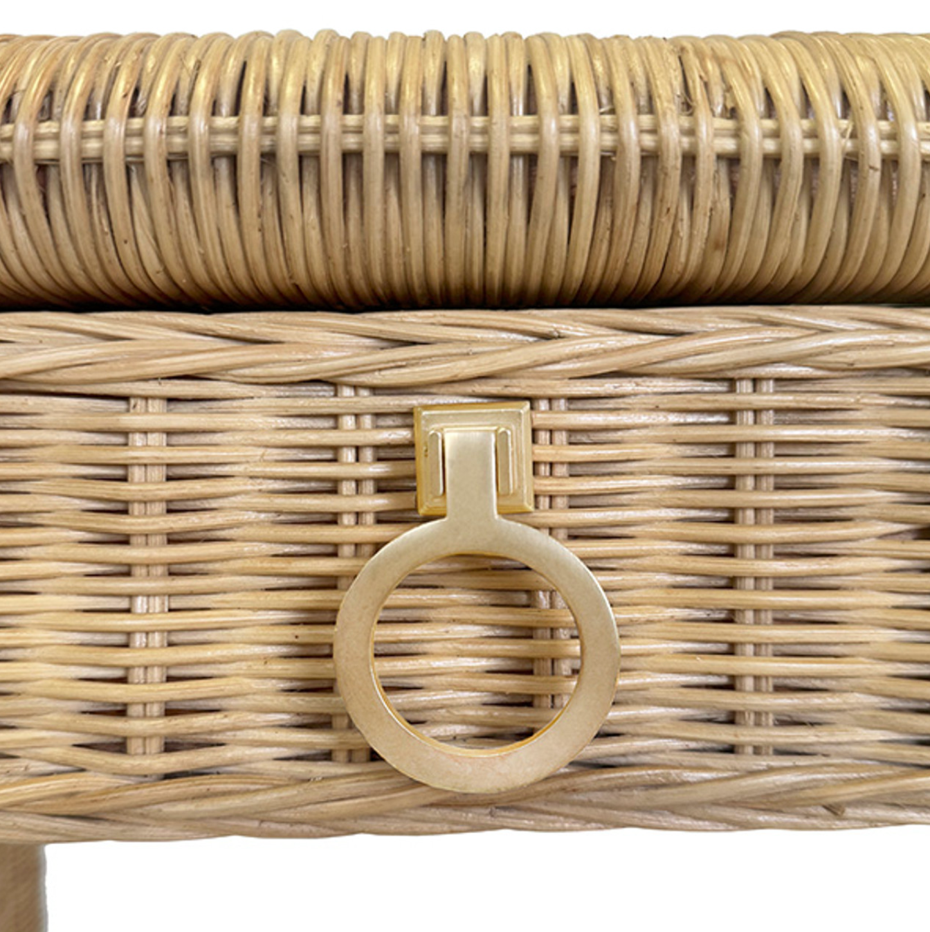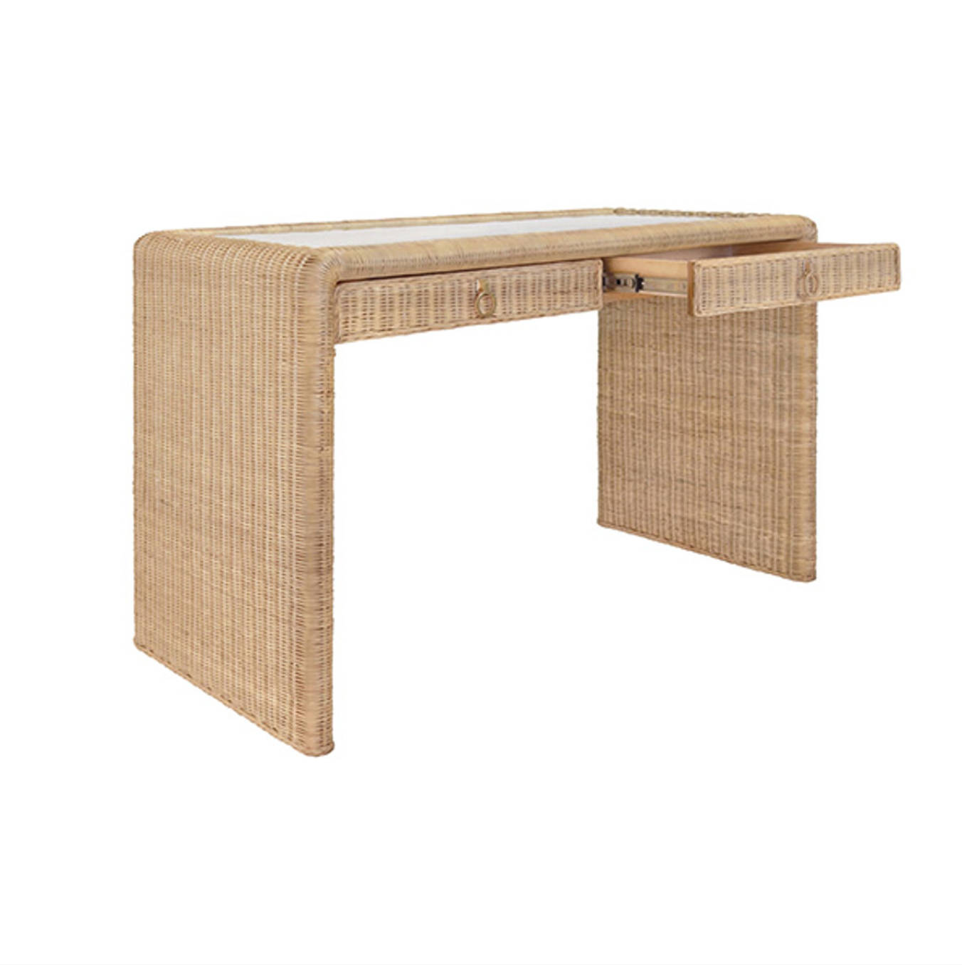 Adrien Rattan and Glass Top, Waterfall Edge, Two Drawer Desk with Satin Brass Hardware